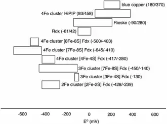 Ranges of reduction potentials, Eo (mV), covered by the different classes of iron-sulfur proteins, heme proteins, and copper proteins. (HiPIP = High potential iron-sulfur proteins, Rdx = rubredoxins, Fdx = ferredoxins, Cyt = cytochromes.)