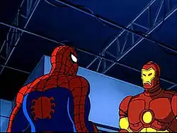 Iron Man and War Machine appear in Spider-Man. Throughout the series, they serve as allies to Spider-Man. As Dorian Harewood was already voicing Tombstone in the series, James Avery reprised War Machine. In the "Secret Wars" episodes, Iron Man transported to the Beyonder's Battleworld before being returned to Earth with no memory of the events.[12]