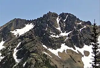 Iron Mountain is a 6,826-foot (2,081-metre) elevation summit located in the eastern Olympic Mountains in Jefferson County of Washington state.[4] It is set within Buckhorn Wilderness, on land managed by Olympic National Forest. It is situated between Buckhorn Mountain, 0.58 mi (0.93 km) to the southwest, and Mount Worthington, 0.76 mi (1.22 km) to the northeast.[1] Precipitation runoff from Iron Mountain drains south into the Big Quilcene River, and north into Copper Creek which is a tributary of the Dungeness River. Topographic relief is significant as the southeast aspect rises 2,800 feet (850 meters) above the Big Quilcene River in less than one mile, and the north aspect rises 1,700 feet (520 meters) above Buckhorn Lake in one-half mile. Old-growth forests of Douglas fir, western hemlock, and western redcedar grow in the valleys surrounding the peak. The nearest community is Quilcene 11 miles to the east.