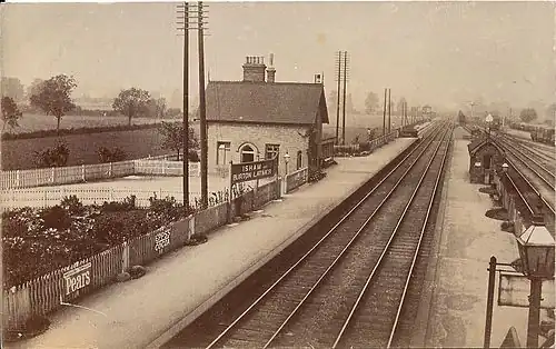 Isham and Burton Latimer railway station was built by the Midland Railway in 1857 to serve the villages of Isham and Burton Latimer on its extension from Leicester to Bedford and Hitchin.[2] It closed in 1950 and the building has since been converted into a house.