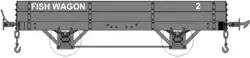 Five low-sided wagons were built on four-wheeled underframes released from coaches that had been placed on bogie underframes ("pairs"). These wagons were numbered in a separate sequence without a letter prefix. They did not survive into the nationalisation era, although some excellent photographs of them appear in various books dedicated to the railway's history and rolling stock. The wagons were labeled "Fish Wagon" on the left-hand side and carried their nominal fleet numbers on the right. All were painted deep grey with black metalwork.