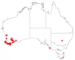 This isopogon grows in wet or swampy areas from near Karridale to Albany in the south-west of Western Australia.[2][3]