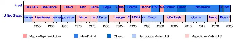 Harry S. TrumanDwight D. EisenhowerJohn F. KennedyLyndon B. JohnsonRichard NixonGerald FordJimmy CarterRonald ReaganGeorge H. W. BushBill ClintonGeorge W. BushBarack ObamaDonald TrumpJoe BidenDonald TrumpDavid Ben-GurionMoshe SharettDavid Ben-GurionLevi EshkolGolda MeirYitzhak RabinMenachem BeginYitzhak ShamirShimon PeresYitzhak ShamirYitzhak RabinShimon PeresBenjamin NetanyahuEhud BarakAriel SharonEhud OlmertBenjamin NetanyahuNaftali BennettYair LapidBenjamin NetanyahuUnited StatesIsrael