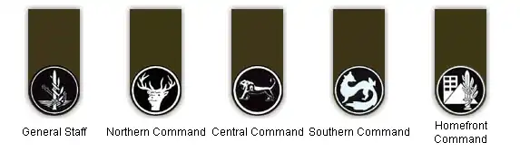 Typically, each IDF unit (yehida) has its own shoulder tag (tagei katef).[8] Shoulder tags consist of a long section and a tip, which can be one of four shapes: a circle (commands, directorates and air force units except anti-aircraft), a rectangle (Golani Brigade), a diamond, or a shield-like shape (most common). Shoulder tags are only worn on dress uniforms, on the left shoulder attached to the shoulder strap.