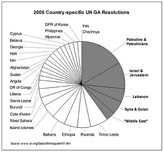 In recent years, the Middle East was the subject of 76% of country-specific General Assembly resolutions, 100% of the Human Rights Council resolutions, 100% of the Commission on the Status of Women resolutions, 50% of reports from the World Food Programme, 6% of United Nations Security Council resolutions and 6 of the 10 Emergency sessions.[91]