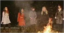 A scene from the video for "Issues" where The Saturdays are standing around a blazing fire.