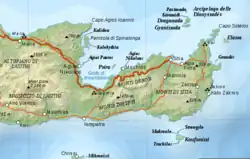 A number of archaeological sites are dotted around the isthmus. The bronze age site of Vasiliki (Βασιλική), in the middle of the isthmus, lends its name to an early form of Minoan pottery found primarily on the site.[1] Other Minoan sites in the vicinity are Gournia, Priniatikos Pyrgos and Chalasmenos (Χαλάσμένος). The Neolithic refuge site of Monastiraki Katalimata (Μοναστηράκι Καταλύματα) is located high up on the northern side of the Ha Gorge.