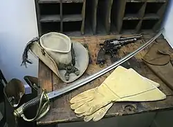 As the 5th Michigan Cavalry streamed in retreat past Stuart, a dismounted Union private, 44-year-old John A. Huff, turned and shot Stuart with his .44-caliber revolver from a distance of 10–30 yards.[74] The large caliber round cut through Stuart's abdomen and exited an inch to the right of his spine.[75] Stuart fell into the arms of Company K's commander, Gus W. Dorsey. Dorsey caught him and took him from his horse. Stuart told him: "Dorsey...save your men." Dorsey refused to leave him and brought Stuart to the rear.[76][77][78]