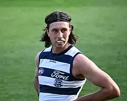 Jack Henry (born 29 August 1998) is a professional Australian rules footballer playing for the Geelong Football Club in the Australian Football League (AFL). He was drafted by Geelong with their first selection and sixteenth overall in the 2016 rookie draft.[1] He made his debut in the one point loss to Hawthorn at the Melbourne Cricket Ground in round two of the 2018 season.[2] In his sixth match, he recorded eighteen disposals, eleven marks (including five intercept marks), and three tackles in the sixty-one point win against Greater Western Sydney in round seven to earn the round nomination for the 2018 AFL Rising Star. Henry moved forward in the second half of the 2018 AFL season and kicked 8 goals in a handful of games in the forward line, including a three-goal haul against Brisbane at GMHBA Stadium.[3]