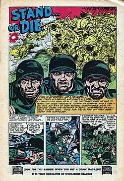 Katz went to work for Standard Comics and its imprints in 1951, doing horror comics, war comics and some romance comics until the company went out of business. From this period comes some of the earliest work that can be identified as his, such as Adventures into Darkness #10 (June 1953).[10]: 21 From 1952 to 1956, Katz worked as a penciler and inker at the studio of Jack Kirby and Joe Simon, working alongside Mort Meskin and Marvin Stein. Kirby taught Katz how to ink and use lighting to emphasize dramatic scenes.[11]: 37–8 Katz was inspired by Dean Cornwell and Harvey Dunn's illustrations to put a lot of detail in his work.[12] The intricate style slowed Katz's work pace, and he was let go. He began working at Timely Comics under Stan Lee around 1954.[11]: 40 [3]: 37 Katz worked on war and horror comics, as well as Westerns, but his pacing continued to cause friction. Without Lee's knowledge, Katz worked on the side for Fiction House, which slowed him down even more. In 1955 he left mainstream comics to paint and teach art, both privately and for the YMCA in New York City.[11]: 46 His hiatus from the industry lasted 14 years.