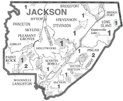 Jackson County is the northeasternmost county in the U.S. state of Alabama. As of the 2020 census, the population was 52,579.[1] The county seat is Scottsboro.[2] The county was named for Andrew Jackson, general in the United States Army and afterward President of the United States of America.[3] Jackson County is a prohibition or dry county, but three cities within the county (Bridgeport, Scottsboro, and Stevenson) are "wet", allowing alcohol sales. Jackson County comprises the Scottsboro, Alabama Micropolitan Statistical Area, and Jackson county is included in the Chattanooga–Cleveland–Dalton combined statistical area. It is the site of Russell Cave National Monument, an archeological site with evidence of 8,000 years of human occupation in the Southeast.