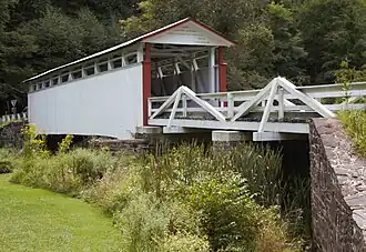 The Jacksons Mill Covered Bridge is a historic wooden covered bridge located at East Providence Township in Bedford County, Pennsylvania. It is a 91-foot-long (28 m), Burr Truss bridge, constructed in 1889. It crosses Brush Creek. It is one of 15 historic covered bridges in Bedford County.[2]