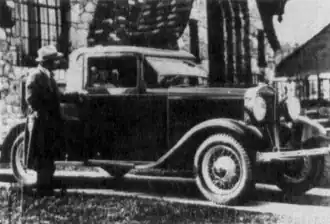 ![]() Charles Jaeger, the creator of the car, seated in the first Jaeger car to be manufactured, in 1931. Photographed in front of the family home he built, 215 W. Woodland Avenue, Ferndale. | |