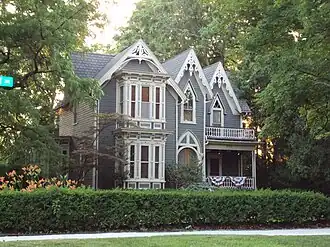 This house is a two-story wood frame Gothic Revival structure covered with clapboard. It has an L-shaped plan with a tower-like projection in the front containing the entrance. Two single-story additions are in the rear, constructed in the late 19th and early 20th century. The original portion of the home is three bays wide, each topped with a steep gable containing ornamental bargeboards in the gable ends. The elaborate detailing includes Gothic pointed arch door and window enframements, and single- and two-story bay windows.[2]