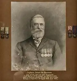 McPherson was born into a Highland family in 1831 or 1832.[1] He arrived in New Zealand on the Calcutta in May 1861 as Ensign of the 70th Regiment with his wife and two children.[2] Later, he was paymaster in the Commissariat Transport Corps. In July 1864, he received his commission as captain and joined the 4th Waikato Regiment.