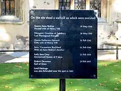 Sign at the scaffold of the Tower of London marking Lady Rochford's place of execution.