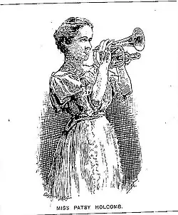 Jane Quirk was born Patsy Jane Holcomb, around 1878 in Keytesville, Missouri, the daughter of Ethan Holcomb and Martha Price.[1] She was raised in Cedar Rapids, Iowa,[2] where from a young age she performed as a singer, dancer and cornetist, along with her brother and sister at social occasions and church events.[3][4] During her teens she lost most of her family, with her sister,[5] brother[6] and mother[7] dying within a five year period. Jane's father died in 1901.[8]