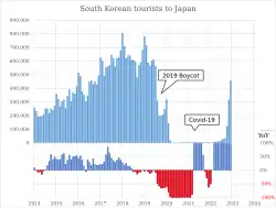 267. ^ 韓国からの旅行者、9月は58%減...関係悪化で手控える動き [South Korean travelers' 58% decrease in September...refrain from traveling as worsening relationships] (in Japanese). Sankei Shimbun. October 16, 2019. Archived from the original on October 16, 2019. Retrieved October 16, 2019.