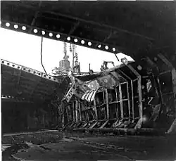 Katsuragi's keel was laid down by the Kure Naval Arsenal in Kure, Hiroshima, on 8 December 1942.[2] She was launched on 19 January 1944 and completed on 15 October 1944.[12] The ship was transferred among a number of ports on the Inland Sea until she arrived in Kure on 15 February 1945 and she was ordered to be camouflaged. Her flight deck was disguised with fake trees, houses and roads; however, her anti-aircraft batteries remained fully manned. Her intended air group, Air Group 601, was committed to the Battle of Iwo Jima about that same time. On 19 March, the ship was attacked by aircraft from Task Force 58 and lightly damaged by several rocket hits; one man was killed and three wounded in the attack. Five days later, the ship was semi-permanently moored at the island of Mitsukojima in Kure harbor and extensively camouflaged. On 20 April, Captain Toshio Miyazaki was appointed commanding officer of Katsuragi.[13]