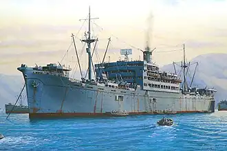 On 9 January 1944 Nigitsu Maru left Palau for Ujina in convoy FU-901 as the sole merchant ship escorted by the destroyer Amagiri. She carried about 2,000 troops, mainly soldiers of the 12th Independent Engineer Regiment. Three days later off the Okino-Daito Island, southeast of Okinawa, Nigitsu Maru was attacked by the US submarine Hake which fired four torpedoes from the surface. Two hit Nigitsu Maru which sank in eight minutes at 23°15′N 132°51′E / 23.250°N 132.850°E / 23.250; 132.850. 456 soldiers, 83 gunners and 35 crewmen were killed. Amagiri picked up the survivors and landed them in Japan.[2]