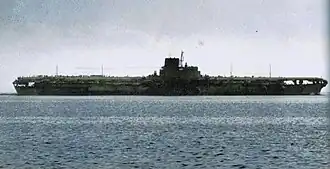 The carrier's 256-meter (839 ft 11 in) flight deck was 40 meters (131 ft 3 in) wide and overhung her hull at both ends, supported by pairs of pillars.[12] A large island, modeled on that fitted on the earlier Taihō, was sponsoned off the starboard side and integrated with the ship's funnel. Much like Taihō, the only other Japanese carrier with an armored flight deck, Shinano's flight deck functioned as the ship's strength deck and copied British practice as seen in their Illustrious-class carriers. Designed to resist penetration by 500-kilogram (1,100 lb) bombs dropped by a dive bomber, the flight deck consisted of 75 millimeters (3 in) of armor plate laid over 20 millimeters (0.8 in) of ordinary steel.[8] It was equipped with 15 transverse arrestor wires and three crash barriers that could stop a 7,500-kilogram (16,500 lb) aircraft;[13] five of these wires were positioned further forward to allow the ship to land aircraft over the bow in case the aft portion of the flight deck was unusable.[8]