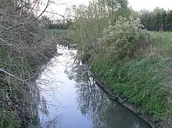 Starting with the late 1830s, with the advent of steam engines in the city's factories, the river ceased to function primarily as a source of water power and became a recipient of waste water.[19] The situation deteriorated throughout the nineteenth and into the twentieth century as the river continued to receive significant amounts of polluted waters.[20] In the 1890s Karl Scheibler's factory was established directly above the river, which flowed beneath the factory's floor, enabling easy discharge of industrial waste.[21][22] When the construction of the city's sewer system began in 1925, the city's natural river network, including Jasień, was incorporated within the new underground canal system,[23] and the river valley is now marked in some sections of the city centre only by the landscape retaining some of the original valley slopes,[24] with the stream itself hidden from view for more than one third of its course.[25] As the Jasień became part of the city's canal system, its main function became the transfer of both industrial and residential waste water and rainfall outside Łódź towards the Ner river.[26][27] The twentieth century saw the construction of chemical plants on the Jasień, and the river was used for the disposal of toxic waste. It was only after the fall of communism in 1989 and after the collapse of the textile industry that the production of waste was reduced by 60%.[28] The contamination levels in the waters of the Jasień have been systematically dropping since then.[29] The current status of the river is that of an engineered stream whose function is to discharge rainfall from the area of the city.[30] Only the final section of the Jasień in Rokicie survives in its natural, meandering form.[31]