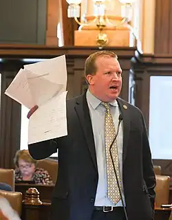 In the fall of 2019, the Illinois House and Senate established a new ethics committee to study and recommend tougher ethical laws that might prevent abuses of power, corruption, or inside dealing within the legislature.[33] Plummer sought and received an appointment to the committee but then declined the appointment. Communications between then GOP Leader Bill Brady and Plummer came to light that revealed Plummer refused the appointment because he claimed Brady offered him the appointment on the condition that Plummer would not file ethics legislation he had drafted, a bill supported by other senators but that would have impacted Brady personally.[34] According to media reports, Plummer had openly pressured Brady to pursue more stringent ethical reforms in private Senate Republican meetings, but the Minority Leader opted to embrace "low-hanging fruit" offered by Democrats.[35][36] Plummer, a first term senator at the time, received favorable commentary from other legislators and the media for his actions and subsequently filed a package of bills focused on ethics and corruption.[37][38]