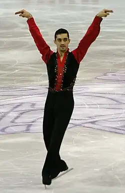 In December 2012, Fernández won his third national title.[40] At the 2013 European Championships he missed some practice time due to his skates being lost at the airport, but they were found one day before the start of the competition.[22][41] Second in the short program, Fernández then placed first in the free skate, landing three quads jumps with one in combination.[42][43] He won the gold medal and became the first Spanish skater to win a European title.[44][45] He posted a new personal best overall score of 274.87 points. He later joked, "I have to make sure I lose my skates again!"[46] At this time, Spain had just 14 indoor rinks and 600 registered figure skaters.[13]