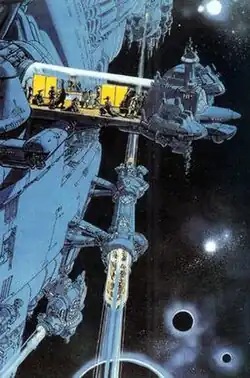 Outside of comics, Mézières' art has been especially influential on science fiction and fantasy film. In particular, several commentators, such as Kim Thompson,[24] Jean-Philippe Guerand[25] and the newspaper Libération,[26] have noted certain similarities between the Valérian albums and the Star Wars film series. Both series are noted for the "lived-in" look given to their various settings and for the diverse alien creatures they feature. Mézières' response upon seeing Star Wars was that he was "dazzled, jealous... and furious!".[27] As a riposte, he produced an illustration for Pilote magazine in 1983 depicting the Star Wars characters Luke Skywalker and Leia Organa meeting Valérian and Laureline in a bar surrounded by a bestiary of alien creatures typical of that seen in both series. "Fancy meeting you here!" says Leia. "Oh, we've been hanging around here for a long time!" retorts Laureline.[28] Mézières has since been informed that Doug Chiang, design director on The Phantom Menace, kept a set of Valérian albums and Les Extras de Mézières in his library.[1]