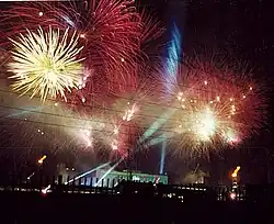 The stadium was almost full when the concert began, but as Beijing's buses stopped running at about 10 o'clock, about half the audience left before it finished.[43] To boost the audience attendance for the second night, Jarre and his production team purchased some of the concert tickets and gave them to children on the streets. Jarre originally wanted the concerts to be free, but the Chinese authorities decided to charge between £0.20 and £0.50 per ticket.[42] In 1982, recordings of the concerts, which featured one of Jarre's signature electronic instruments, the laser harp, were released as a double-disc LP.[31][44]