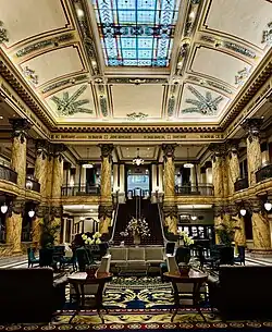 In the check-in lobby, known as the Palm Court, nine original stained glass Tiffany windows with the hotel's monogram remain. The three stained glass windows above the front desk and the stained glass dome are reproductions.