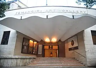 18°55′39″N 72°49′54″E / 18.9274559°N 72.831703°EJehangir Art Gallery is an art gallery in Mumbai (India). It was founded by Sir Cowasji Jehangir at the urging of K. K. Hebbar and Homi J. Bhabha. It was built in 1952. Managed by the Committee of Management, the entire cost of this mansion was donated by Cowasji Jehangir. This gallery is situated at Kala Ghoda, behind the Chhatrapati Shivaji Maharaj Vastu Sangrahalaya, in South Mumbai near the Gateway of India, and has four exhibition halls. The gallery was designed by G.M. Bhuta for G.M. Bhuta & Associates.[1] The gallery closed for 11 months as a part of the COVID-19 lockdown in India and was partially re-opened on 16 February 2021.[2] It has since been fully re-opened.
