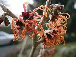 De Belder also began breeding plants, focusing on Hamamelis, Hydrangea and Rhododendron and trees of the genera Malus and Prunus.[1] The couple experimented with Hydrangea paniculata, creating cultivars, including Brussels Lace, Burgundy Lace, Green Spire, Little Lamb, Pink Diamond, The Swan, Unique and "White Moth"[8] among others, as well as Spreading Beauty from Hydrangea serrata.[5][9] Typically gardens feature only one witch hazel, as the plant requires a large growing space. De Belder, propagated forty varieties at Kalmthout.[3] One of the seedlings named after their daughter Diane, received the Award of Garden Merit in 1993 from the Royal Horticultural Society for its intense red color.[2]