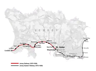 The Jersey Railway was originally a 3+34 miles (6.0 km) long standard gauge railway on Jersey in the Channel Islands. Opened in 1870, it was converted to 3 ft 6 in (1,067 mm) narrow-gauge in 1884 and extended 7+34 miles (12.5 km). The line closed in 1936.