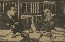 Casariego's tenure in El Alcazár was marked by permanent conflict with the owners and the board, headed by general Moscardo; it resulted from personal decisions[74] and conflicting managerial visions rather than from political discrepancies, both sides blaming each other for dropping sales and poor commercial performance.[75] In 1942 the conflict escalated to legal denunciations over alleged illegal trading in paper; official investigation strengthened Casariego's position.[76] As press envoy from a neutral country he travelled across the war-torn Europe and interviewed Hitler, Mussolini and Churchill.[77] In terms of political line El Alcazár demonstrated more than zealous loyalty to the new Spain, exalting Franco, Falange and the new Spain in general.[78] However, Casariego did not abandon his earlier ideological leaning: one of key threads which characterized El Alcazár’s profile of the period was "tradicionalismo de raíz carlista", combined with "hispanismo imperialista".[79] He also made sure that these members of El Siglo Futuro staff who survived the war found employment in El Alcazár.[80]