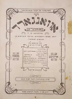 In August 1908 the group began publishing the monthly Der Avangard ('The Vanguard').[1][5] During this the period of 1908–1910 Der Avangard mainly re-published Bundist materials coming from the Bund Foreign Committee in Geneva.[3] Contributors to Der Avangard included M. Olguin, Hersz Libman, A. Litvak, I. Salutzky and D. Pinski.[3] The monthly publishing of Der Avangard was discontinued in December 1909.[1] Der Avangard was again published February–May 1910.[1] In 1910 all the socialist organization in Argentina were forced to suspend their activities under the State of Siege announced during the Argentina Centennial, including Avangard that hibernated for half a year.[1]