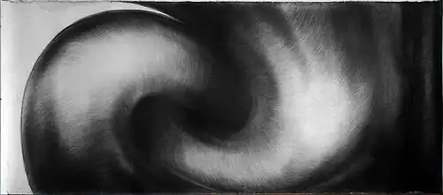 Giant objects from the beginning of the 1990s offer perfect spatial illusion of voluminous figures of organic shape (And out/aerial meditation, charcoal on cardboard, 220 x 500 cm, 1990–1992, It, charcoal on cardboard 220 x 480 cm, 1989–1992). The time range of their creation bears witness to how technically demanding these drawings are.