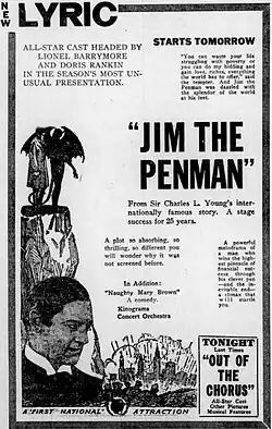 Jim the Penman is a 1921 American silent crime drama film produced by Whitman Bennett and distributed through Associated First National, later just First National Pictures. It was based on Charles Lawrence Young's circa-1886 play Jim the Penman, about a forger in Victorian Britain (itself probably adapted from Felix Philippi's 1884 play Der Advokat). The film stars Lionel Barrymore and was directed by Kenneth Webb, the duo having worked on The Great Adventure previously. Jim the Penman is preserved, though incomplete (reel 5 missing), at the Library of Congress.[1][2][3]