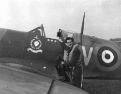 I was on a sweep leading green section when I saw a ME 109F about to attack my number two. I turned after him and shot him down and then lost our squadron. I was going to head for England when I saw a squadron above about ten to twenty miles inside France. I didn't know who they were so I headed towards them. When I was close enough I saw that they were ME 109E's. About 12-15 flying in formation . I attacked shooting down the first Gerry. I missed the next then damaged a third, who might have crashed, and was going to shoot at a fourth when my ammunition was finished. I could see nothing but Gerrys around me and I beat it for England as fast as I could go doing all kinds of queer maneuvers to keep the ME 109's away from me. That was my first fight and yesterday I had my second. We were on a sweep just crossing the coast when 90 + ME 109's attacked us. I had a couple of unsuccessful brushes and being separated from the rest my number two and I started to fight our way home. We were attacked by four ME 109's out over the Channel, we took on two apiece but mine headed for France. I lost my number two then and was headed for home when I saw two of three ME 109's that were attacking a damaged Spitfire. I attacked them shooting the first down and damaging the other and was then attacked by the third ME 109. He hit out for France after a slight scrap and I returned to base. The pilot of the damaged Spitfire said he thought I was an angel from heaven when he saw me coming to help him.