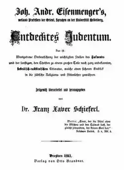 - ^ a b Hartmann, Anton Theodor (1834). Johann Andreas Eisenmenger und seine jüdischen Gegner. cited by Koch, Jens (1997). Johann Andreas Eisenmenger: sein Werk und dessen Wirkung (PDF) (in German). Projekt in der Herzog August Bibliothek Wolfenbüttel. p. 14.