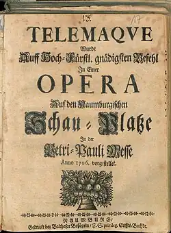 He wrote his first opera libretto for Georg Caspar Schürmann's opera Das verstöhrte Troja, which was performed in 1706 at the Opera House at Hagenmarkt in Braunschweig. In 1706, he wrote the libretto for the opera Telemaque performed at the Opernhaus vorm Salztor in Naumburg in the same year, for which Georg Caspar Schürmann also composed the music and Samuel Rudolph Behr[5] contributed ballet interludes. The opera was performed again in 1717 by both of them as Telemachus and Calypso, reworked, at the Braunschweig Opera[6] and was staged again in 1722 in Bayreuth. Whether he also directed the opera house in Naumburg is not clearly established.