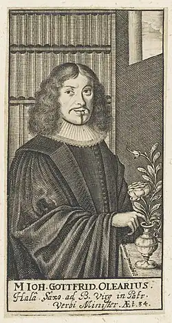 Johann Gottfried Olearius (1635–1711) was a German preacher, musician and horticulturalist. (The name "Olearius" is the Latinised version of the German name Ölschläger.) Johann Gottfried was a member of a large, extended family of pastors, theologians, professors and lawyers in Halle, Leipzig and Weissenfels. He was the superintendent and pastor of the Barfüsserkirche (later the St. Paul's Church, Frankfurt am Main). He had been an accomplished church musician and supervised the young Johann Sebastian Bach when he was a church organist at Arnstadt from 1703 to 1707.[1][2][3] Olearius also had an interest in horticulture, and the plant genus Olearia was named in his honour by Conrad Moench.[4][5]