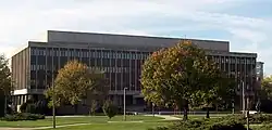 While he worked on increasing the size of M.S.C.'s student body, Hannah also expanded the institution from a college of regional reputation into a nationally recognized research university. When the University of Chicago eliminated its athletics and resigned from what is now the Big Ten Conference in 1946, Hannah lobbied hard to take its place. The Big Ten finally admitted M.S.C. in 1950. Five years later, on the College's centennial year of 1955, the State of Michigan made it a university.[3] In 1957 he continued M.S.U.'s expansion co-founding Michigan State University–Oakland (now Oakland University) with Matilda Dodge Wilson. The Hannah Hall of Science on Oakland University's campus is named for him.[4] Michigan State University continued to expand throughout the 1960s, completing its newest dormitory in 1967. None have been built since.