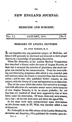 Dr. Warren's article "Remarks on Angina Pectoris" on the first volume of New England Journal of Medicine and Surgery in January 1812