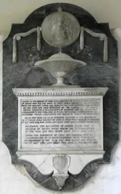 "Sacred to the memory of John Clevland Esqr. of Tapley in the county of Devon who for the space of forty years served his king and country with the greatest honor and fidelity the last seventeen years of which he was joint and sole secretary of the Admiralty in which office through a multiplicity of business and his constant application to the discharge of it he contracted a complication of disorders which occasioned his death at Tapley 18th June 1763. Near him here lie also interred Elizabeth the daughter of Sr. Caesar Child, Baronet, of Gwin in Essex, with whom he intermarried in the year 1729 who dying left issue three sons and three daughters; Penelope the daughter of Joseph Davie Esqr. of Orleigh in Devon, with whom he intermarried in the year 1743 who dying left issue one son; Sarah the daughter of Chas. Shuckburgh Esqr. of Longborough in Gloucestershire with whom he intermarried in the year 1747 who dying his widow the 5th Decr. 1764 left issue two sons & two daughters"