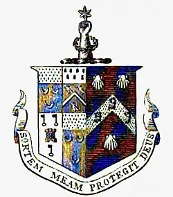 Gules (red) three crescents or (gold), a chief of the last, quartering, Sayer, viz. gules a chevron between three sea-pies argent (white) a chief ermine; and Baker being argent a castle between three keys sable (black). Impaled by Hardy, viz. sable on a chevron ermine between three escallops argent as many griffins' heads, erased of the field.