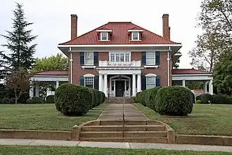 John D. Ballard House, also known as the Ballard-Worsham House, is a historic home located at Bedford, Virginia. It was designed by noted Lynchburg architect Stanhope S. Johnson and built in 1915. It is a two-story, brick dwelling in the Colonial Revival style. It has a steep deck-on-hip roof with terra cotta Spanish roofing tiles, a formal front facade with segmentally arched windows, and a one-story front portico, with grouped Doric order columns. Also on the property is a contributing meat house / tool shed.[3]
