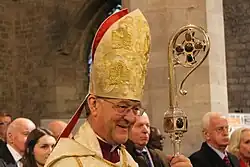On 6 September 2017, Davies was elected the 13th archbishop of Wales;[10] he took up the post with the confirmation of that election the same day. He was the first bishop of Swansea and Brecon to be elected as archbishop of Wales.[11] He was enthroned as archbishop at Brecon Cathedral on 2 December 2017.[12][13]