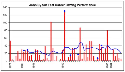 John Dyson's Test career batting performance.
