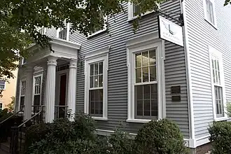 When first built in the mid-18th century, this house was a two-story wood-frame structure. Early in the 18th century a third floor was added, and it was given extensive Federal-style treatment. These alterations included the replacement of original Georgian windows with long windows with eared surrounds. In the 1830s, the Greek Revival portico was added, and Victorian fireplaces were also added. Additions were originally in place on the rear of the house, and in the 20th century it had been adapted for use as a nursing home.[2] It was moved to its present location as part of a redevelopment project, and presently houses commercial offices.